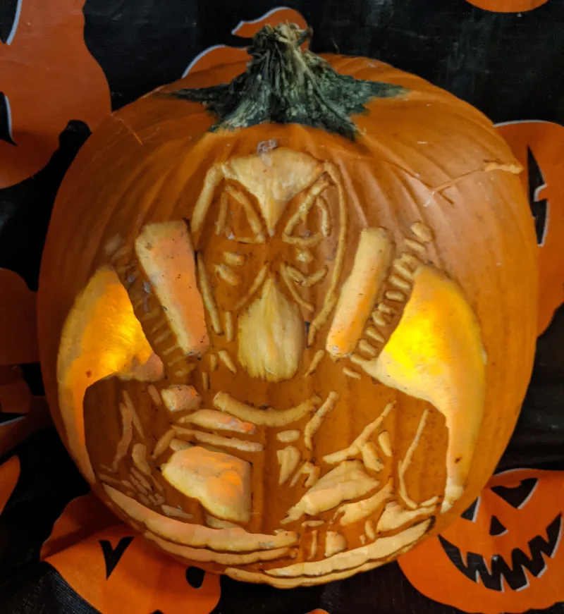 Instead of sawing holes, this style works by removing the orange skin to reveal the pale pumpkin layer underneath. When a light is placed inside, that exposed layer glows softly. By carving deeper into the pumpkin in certain areas, you can make some spots glow brighter than others. The result is one shade that goes from dim to bright.