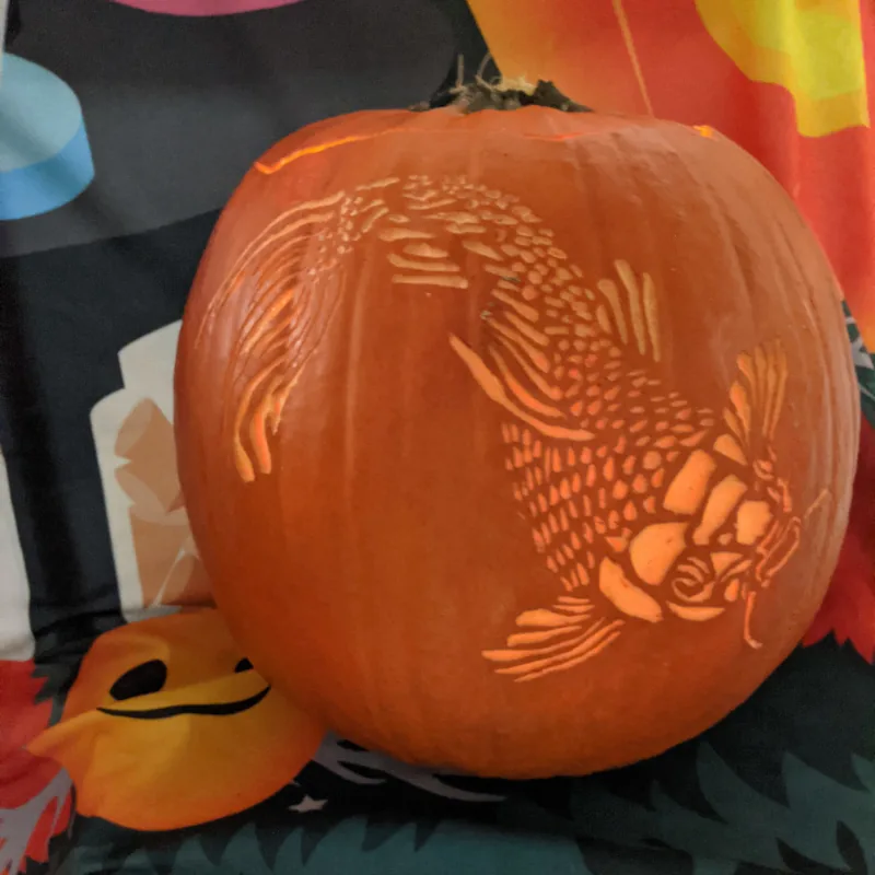 (Photo: Koi fish carved by a 12-year-old in Style 2+. Despite the subject matter, your pumpkin should be completely dry before carving.)