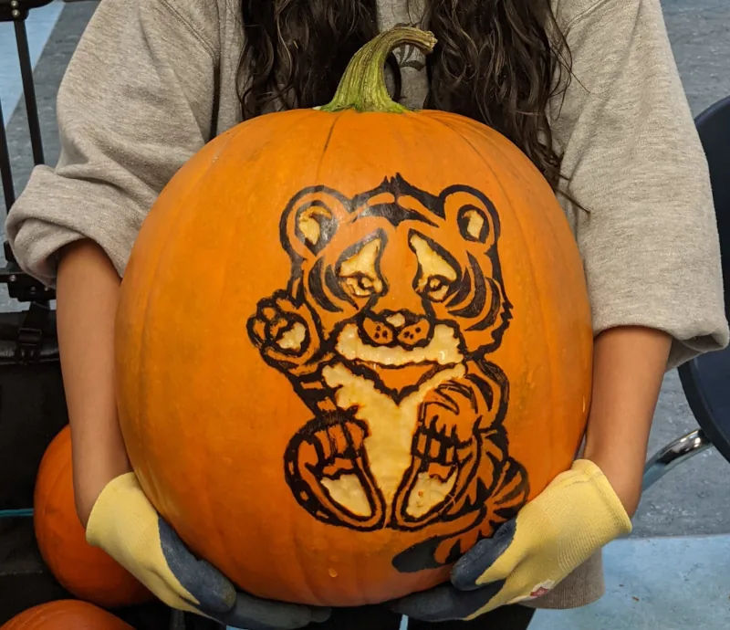I first discovered this style watching a pumpkin carving documentary (yeah, that’s what I do with my spare time) called Oh My Gourd! The Jack-O-Lantern Spectacular Story. It’s about the annual display at Roger Williams Zoo in Rhode Island, which draws over 100,000 visitors every October. Professional carvers there use Sharpie markers in many shades to add detail to 100 lbs (45 kg) pumpkins. I loved the idea of adding another shade with just a Sharpie, and I’ve included the technique when teaching kids ever since.